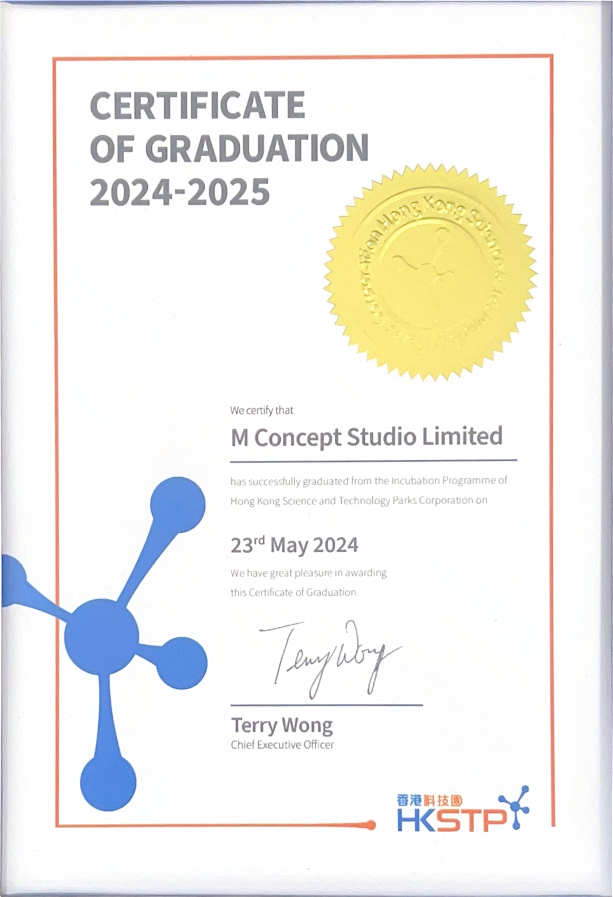 感谢 HKSTP培育计划三年来的支持与栽培,让 M Concept Studio 在创新旅程中获得宝贵资源与专业指导。我们在这段时间不仅提升技术能力,更拓展了业务视野,奠定未来发展的坚实基础。衷心感谢 HKSTP 团队的付出与鼓励,期待继续与生态圈携手,共创更多突破与价值。